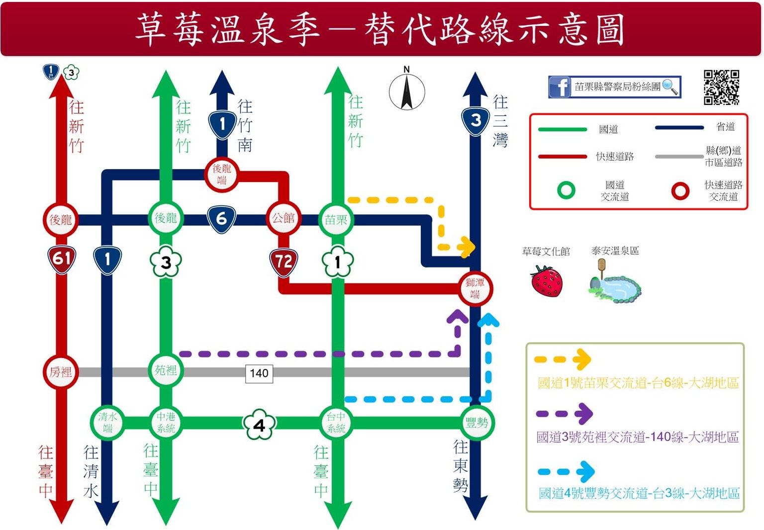 苗栗縣警察局提供來往大湖草莓產地及泰安溫泉地區交通疏導措施如下: