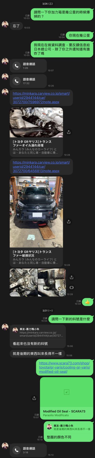 為了證明 GR Yaris 的加力箱有問題,車主還上網搜尋發現GR Yaris 加力箱油封瑕疵在國際間(日、歐、台)已有多起案例,甚至連相同系統的 GR Corolla 也受影響。豐田原廠已於近期將加力箱油封總成由「舊式棕色墊圈」更新為「新式黑色墊圈」(零件編號 36250-42030),國外改裝大廠如 HKS 亦針對此散熱與漏油問題推出強化方案。這足以證明原廠零件設計存在改善空間,而非人為使用問題。