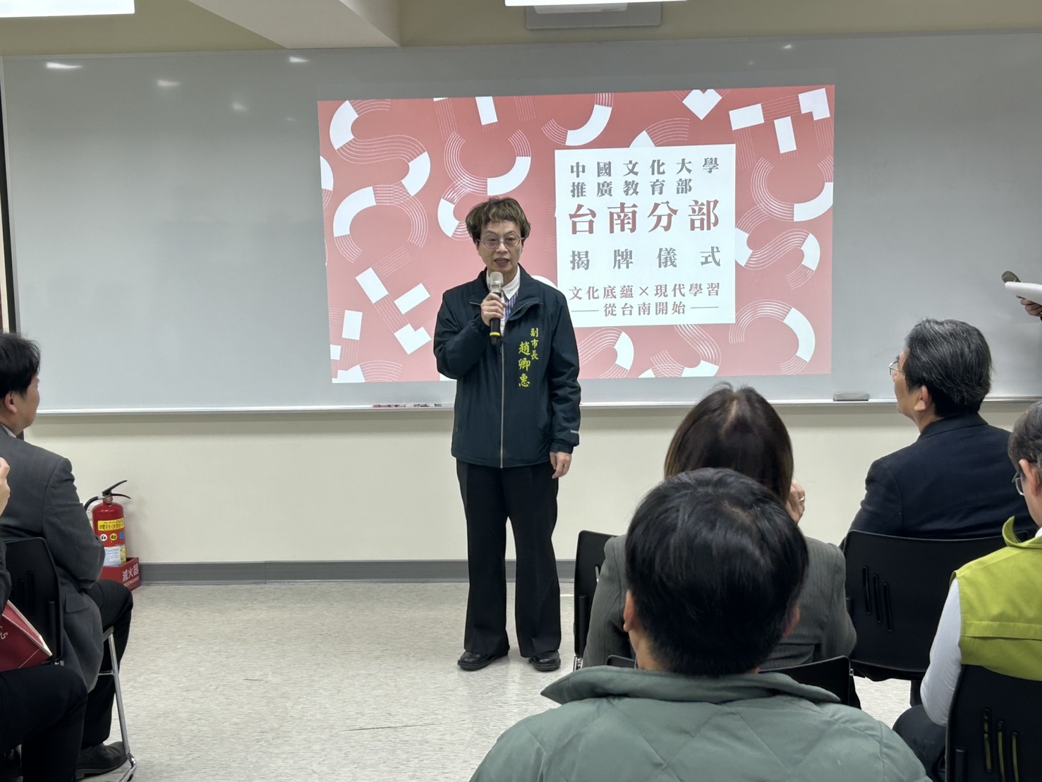 台南市副市長趙卿惠致詞時表示,自己本身也是文化大學校友,今天的開幕典禮更像是一場溫馨的校友聚會。她指出,文化大學是全台校友人數最多的大學,在推廣教育領域更能貼近市民實際需求。她特別肯定文化大學推廣教育部結合觀光旅遊、在地人才培育的努力,並期待未來在綠色旅遊、農村休閒、城市與鄉村不同學習需求的課程推動上,能與市府攜手合作,促進政府與民間的溝通,讓台南的學習樣貌更加多元。